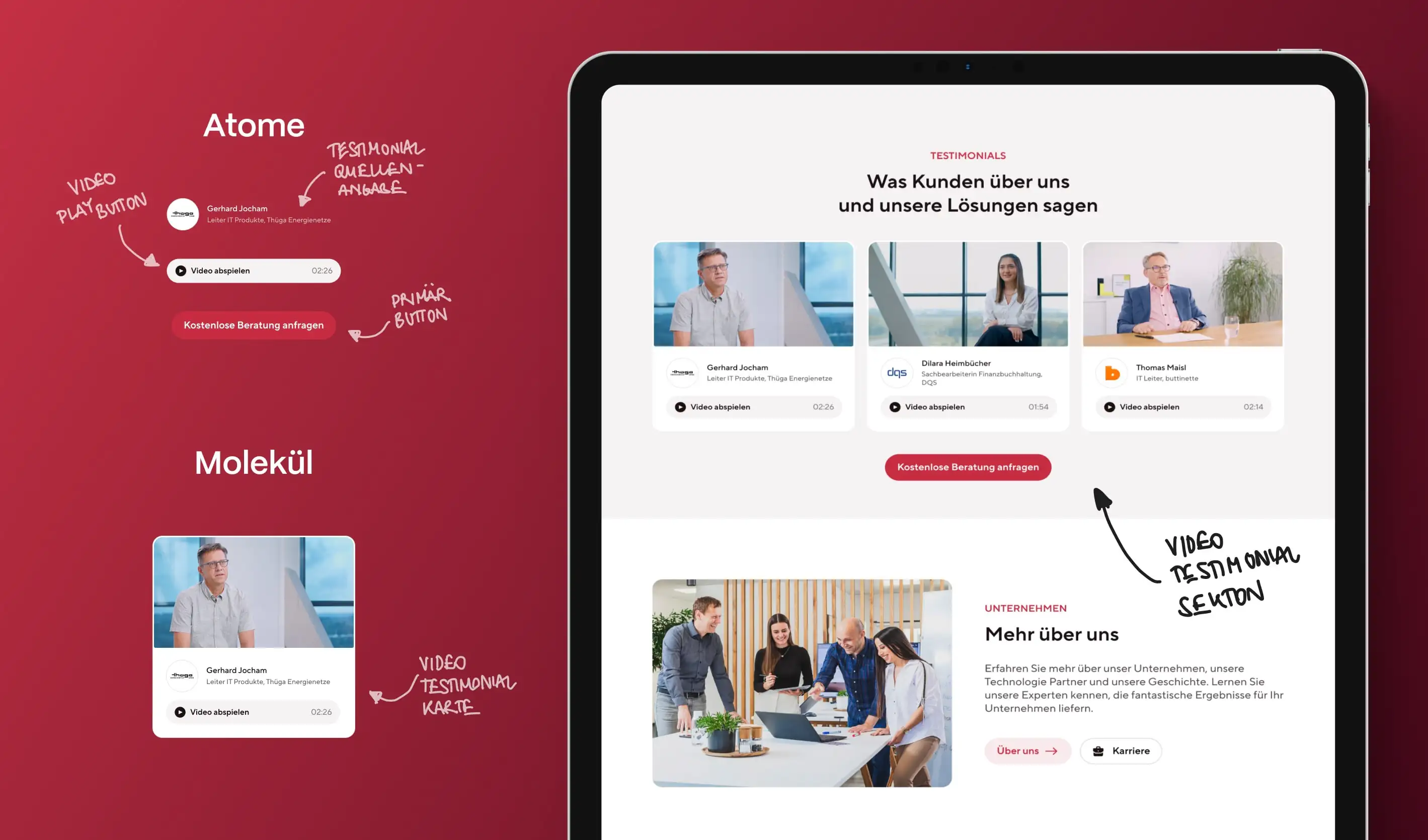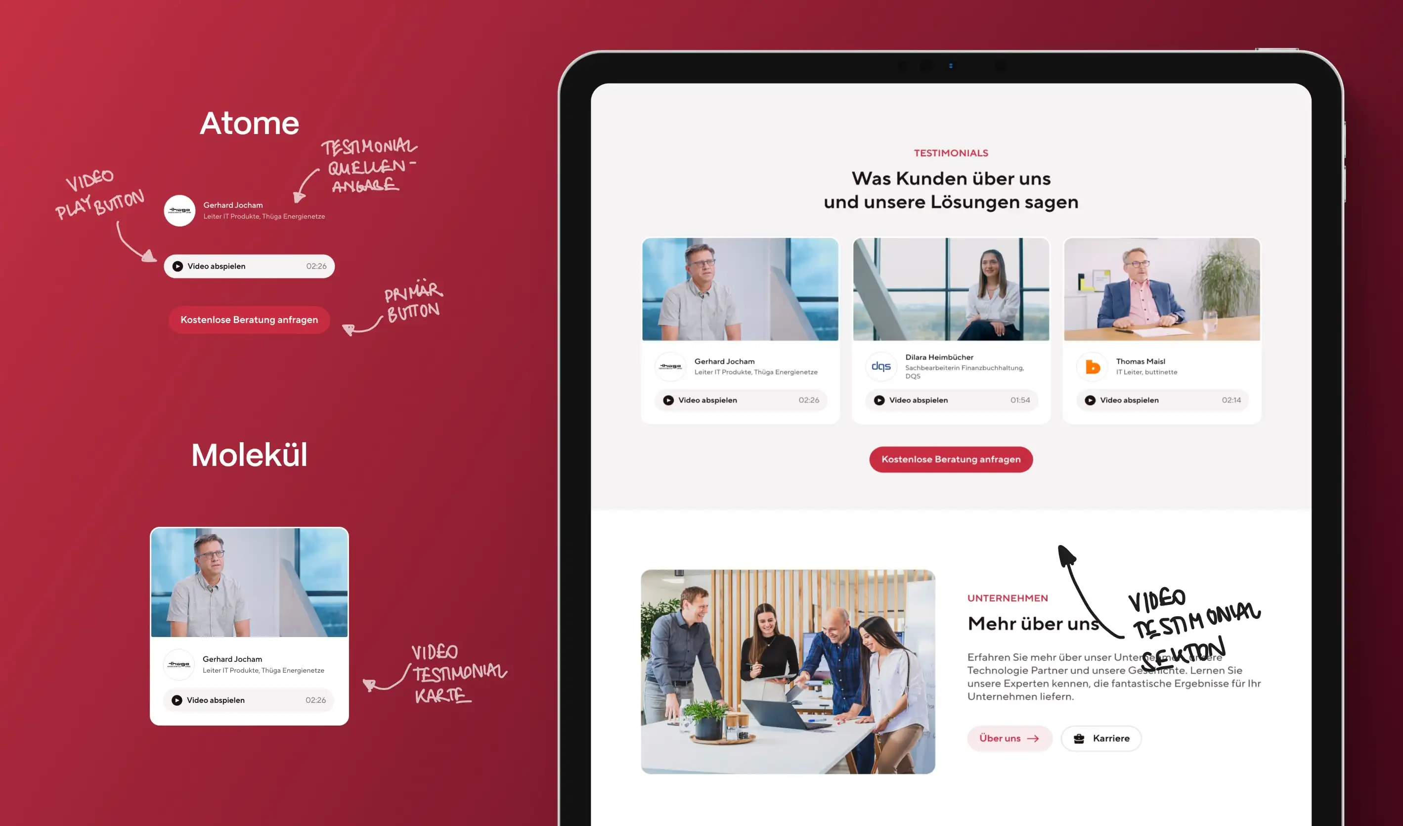 Auf Basis der Analyse haben wir einen neuen Look & Feel konzipiert, der die Professionalität von One Unity unterstreicht. Die technische Umsetzung folgte dem Prinzip des Atomic Design. Hierbei wird das Interface in verschiedene Granularitätsstufen unterteilt: Angefangen bei Atomen (wie Buttons oder Icons), über Moleküle (z. B. eine Teaser-Karte mit Bild, Text und Button), bis hin zu komplexen Organismen. Ein solcher Organismus bildet eine vollständige Sektion, beispielsweise einen Hero-Bereich oder ein Raster aus verschiedenen Leistungs-Karten.